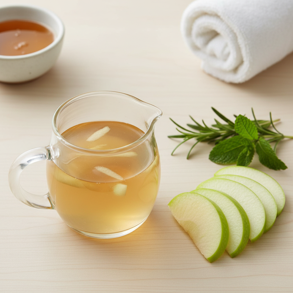 - Apple Cider Vinegar (ACV) Rinse: Mix 1 tsp ACV with 1 cup warm water. Pour over your scalp, massage, and rinse well. This can clarify hair, remove buildup, and impart shine.